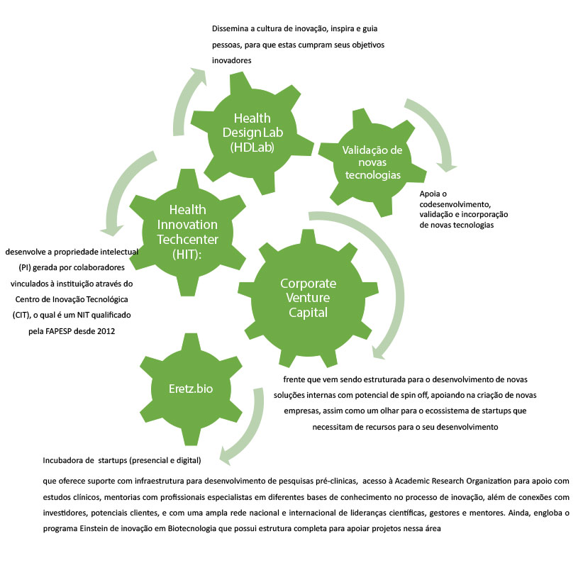 No âmbito do trabalho com inovação, o Einstein possui uma Diretoria de Inovação há 8 anos. A área atua em conceito de inovação aberta e orienta os esforços sistemáticos da instituição para criar novos produtos, serviços e tecnologias na área da saúde, e contribuir para a melhora da qualidade de vida da população. A diretoria de inovação possui cinco pilares que a compõem e tangibilizam a execução dos objetivos estratégicos, que visam apoiar o Einstein e o país em seu desenvolvimento tecnológico